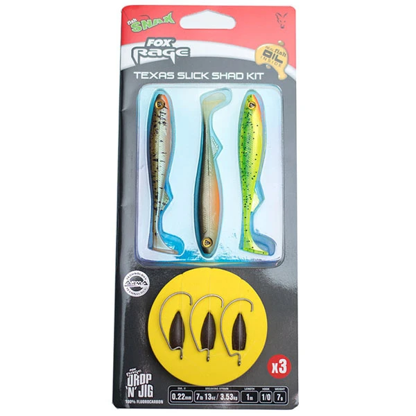 De Ready Rigs Texas Slick Shad Kits van FOX Rage zijn kant-en-klare setjes voor de Texas Rig visserij. De Ready Rigs Texas Slick Shad Kits zijn voorzien van loodvrije gewichten die gemaakt zijn van messing. De Ready Rigs Texas Slick Shad Kits zijn gemaakt van 100% fluorocarbon en worden geleverd inclusief verschillende kleuren FOX Rage Slick Shads.