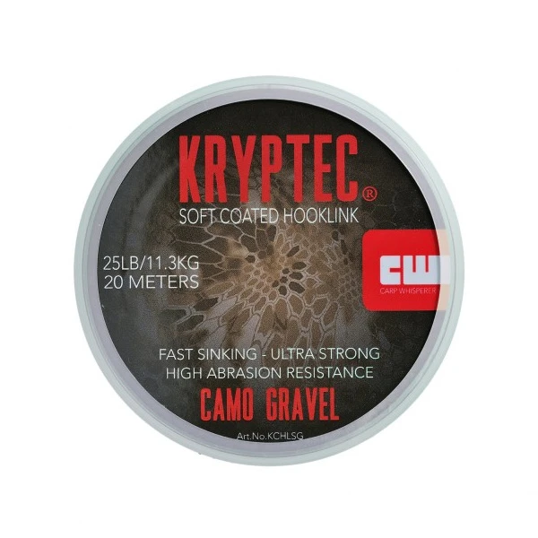 Het Carp Whisperer Kryptec Soft Coated Hooklink is voorzien van een schuurbestendige, matte coating die gemakkelijk te strippen is. Dit maakt dit onderlijnmateriaal uitermate geschikt voor het knopen van stijve combi-rigs en semi-stiff rigs. Het Kryptec Soft Coated Hooklink zinkt goed af en is verkrijgbaar in verschillende kleuren.